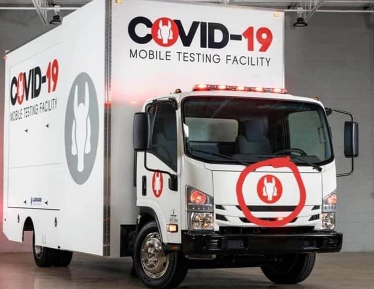 Přijde vám to přetažené? Tak se jdeme ještě podívat na další skládačku ďábelského testování. Všichni jste asi viděli auto s testovacími soupravami covid. V jeho znaku je jakýsi obrazec zvířete/šelmy. (viz obrázek 2)