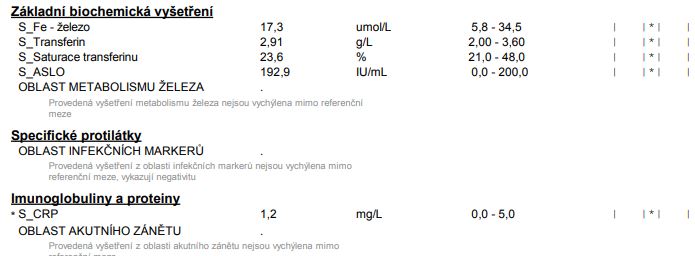 podle výsledků mám u horní hranice ASLO, zásoba železa by tedy podle saturace transferinu měla být v pořádku.