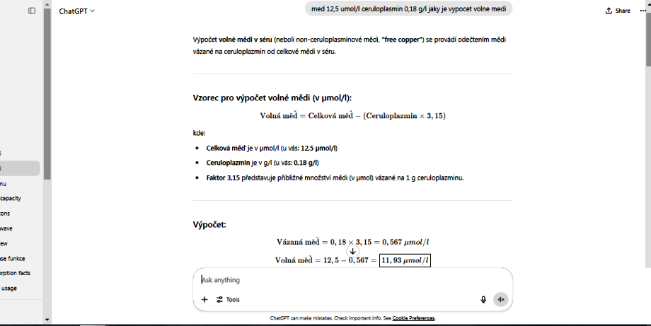 Jinak volná měď = měď - (ceruloplazmin x 47,2) nebo zhruba dvojnásobek hodnoty ceruloplazminu v absolutním čísle bez desetinných čárek jak jsem psal, třeba na měď 15 ceruloplazmin 0,30, ale není to zcela přesné, pouze tak poznáte jedním pohledem že je nebo není velký problém.