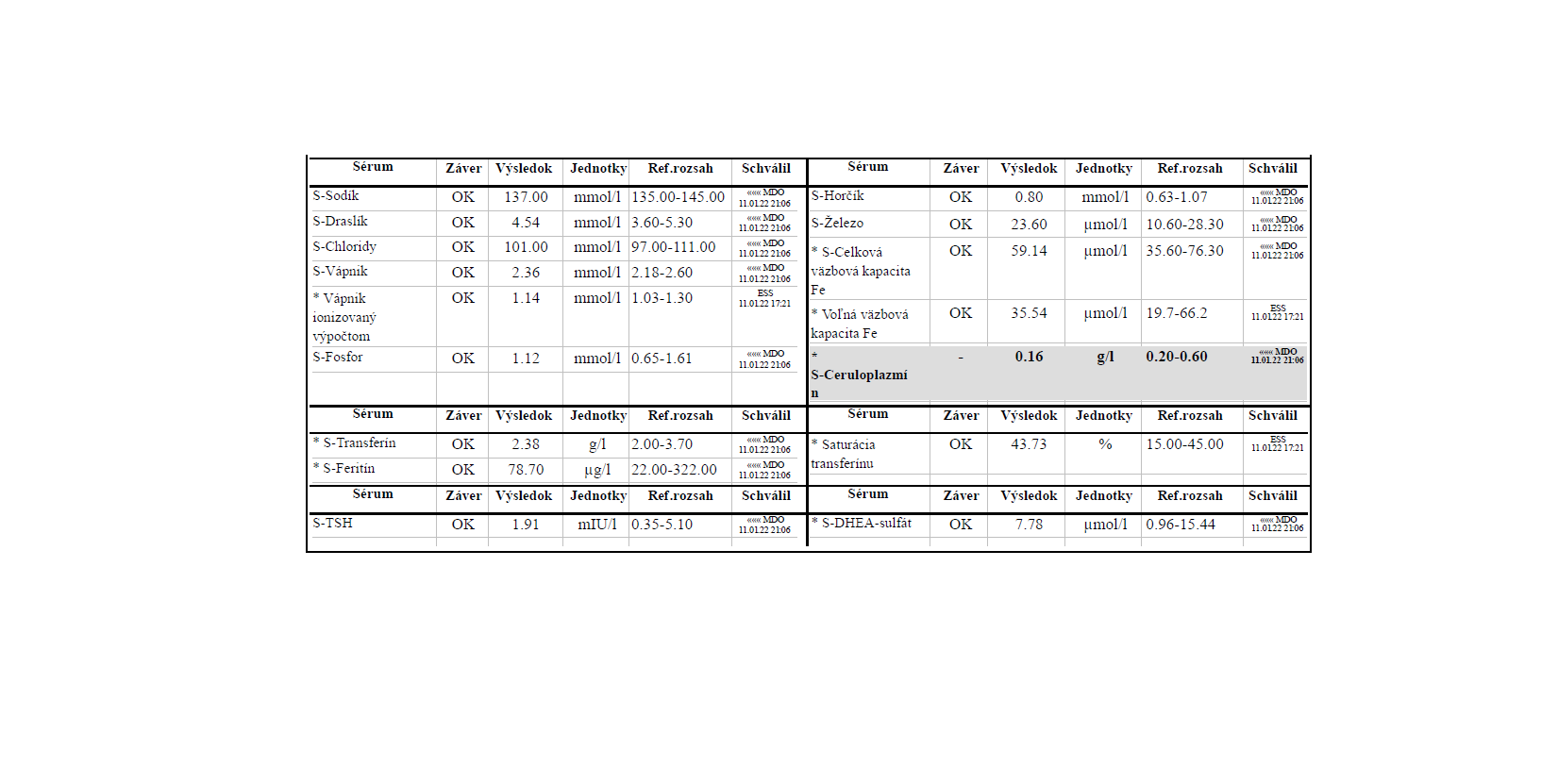 Dobrý deň, príkladám zatiaľ dokončené testy, meď,zinok a homocysteín a aj diaminooxidáza (čo je enzým na štiepenie histamínu ) budu neskôr. už pred 2 rokmi som mal nízku meď aj ceruloplasmín, teraz sa to zase potvrdzuje, nerozumiem prečo. železo vypadá byť dost dobré alebo sa mýlim ? Mimo iné ma velmi znepokojujú biele krvinky, takmer všetky mám nízko, dokonca aj tie bazofily, može to niečo znamenať ? Keď som pred 4 rokmi chcel darovať krv tak mi ju nevzali presne z tohoto dôvodu, nízke biele krvinky. Ide o chronickú bakteriu/vírus ?? Hepatitída? Ale to by som mal pečenové enzýmy rozhodené moje sú v norme či? Ešte tam mám 24 hodín vzorku krvi čiže môžem ich požiadať a dodatočne testy. Dhea-S (indikátor efektivity nadobličiek) je síce zdánlivo v norme no vraj sa to velmi líši podla veku a da sa dokonca určit predčastné stárnutie, v mojom prípade muž medzi 20-29 by som mal mat hladiny od 7,58 do 17,xx takže možem predpokladať oslabene nadobličky? Dal som si hned spravit testosteron čo je tiež indikátor, chcel by som aj kortizol zo slín no test je celkom drahý 4x9 € + 4x skumavka cca 2 eura.. neviem či má ten test pre mna vypovednú hodnotu, aj keby mam oslabenu funkciu tak bud mi daju kortikosteroidy alebo nič... takže v podstate by som tým nič nedokázal len potvrdil pravdepodobne to čo je zrejme... strava na nadobličky mi je jasná no trávenie znemožnuje brat nadobličky ako uplnu prioritu a musim popri tom riešit aj žaludok ktorý mi robí problémy. ďakujem za akúkoľvek radu ohladom testov. AK niekto vie dobre interpretovať železo tak to uvítam.