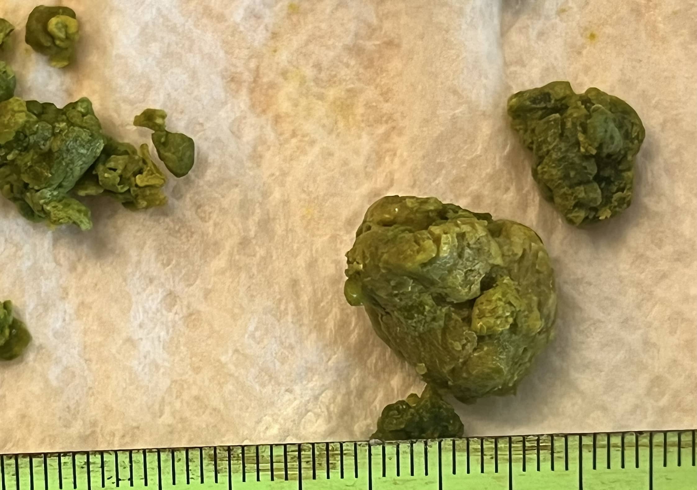 Provedl jsem druhou očistu po 14 dnech od první. Nic nevyšlo. Nevím proč, dělal jsem vše stejně jako už několikrát předtím. Proto jsem zopakoval za tři nebo 4 dny. Bordelu bylo víc než při první. Kameny byly menší než při očistě první a slepovaly se do větších shluků. Některé okolo 1,5 cm.