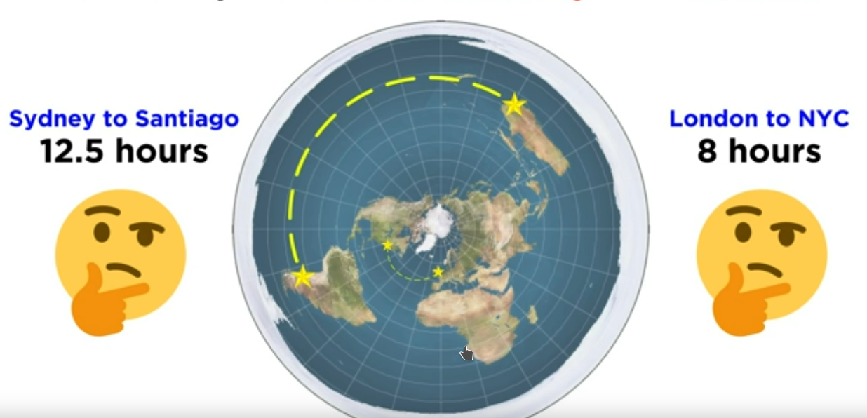 Čo to video o leteckej doprave?? Spadla ti sánka, že.. Nie je ti divné, že zo Sydney do Budenos Aires letia veľkým oblúkom, namiesto toho, aby leteli "priamo" na tvojej placke? A tento mega oblúk trvá 12 hodín v porovnaní s malým oblúčikom na tvojej flat-earth mape medzi Londýnom a Newyorkom. Mm-hmm, zrejme tí na Severnej poloGULI naschvál letia pomaly.