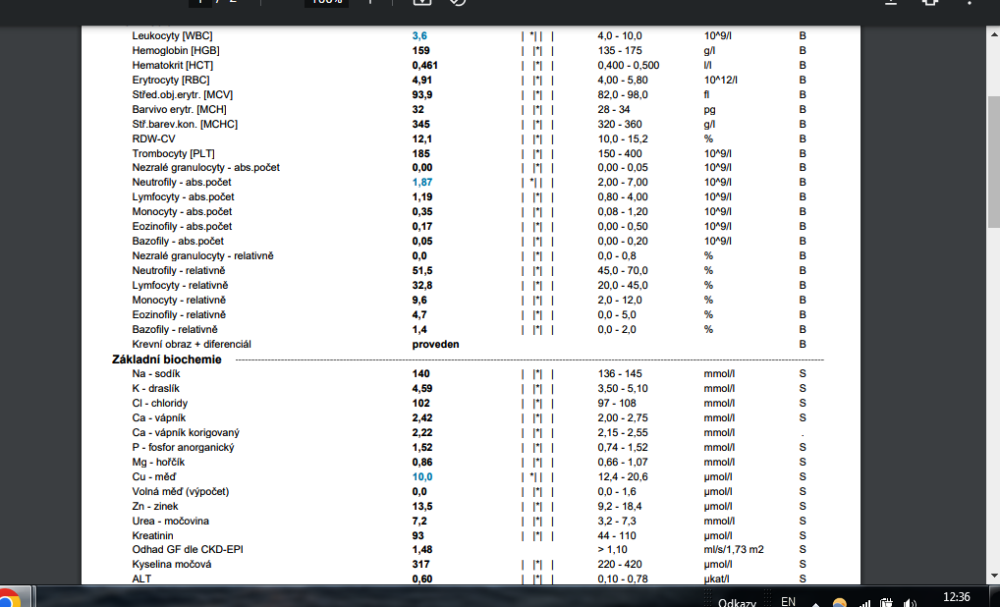 Měď mi spadla kvůli suplementaci zinku, míval jsem jí vůči zinku nadbytek - snažil jsem se stlačit měď zinkem a posunout zinek nahoru a trochu jsem to přehnal, ale už se vrací a poměr je zatím lepší než býval. Ceruloplasmin nikdy nebyl žádný žádný zázrak a volná měď tím pádem vždy byla moc vysoká.