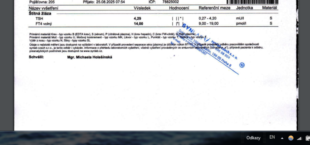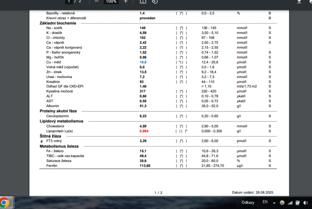 Krevní obraz a základní biochemie ukazuje nízké bílé krvinky (leukocyty, neutrofily). Rozšířená biochemie, štítná žláza, lipidy, železo ukazuje mírně zvýšený lipoprotein (a), železo na dolní hranici, ale transferin a ferritin v pořádku. Opakované vyšetření štítné žlázy ukazuje TSH mírně zvýšené (4.29), FT4 stále v normě asi možný náznak subklinické hypotyreózy.