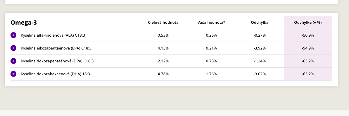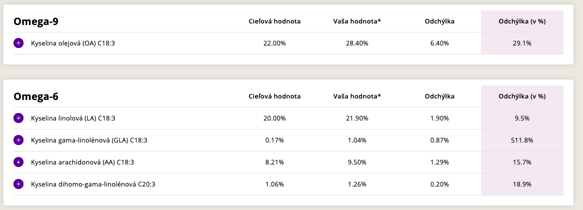 Pokud ty výsledky správně chápu tak máte poměrně masivní deficit omega 3 mastných kyselin a taktéž značný přebytek omega 6 mastných kyselin tedy vlastně tento nepoměr může generovat zánětlivý stav v organizmu. Každopádně se mohu mýlit tento druh výsledků vidím poprvé tedy ten výsledek nemusím chápat správně. Každopádně to je zajímavé a docela by mě zajímalo kdo, kde a za kolik takové vyšetření dělá.