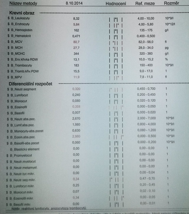 Přikládám výsledky posledních krevních testů, třeba z toho něco poznáte. Dle doktorů je to víceméně v pořádku až na mírně zvýšené jaterní tesy… opět.
