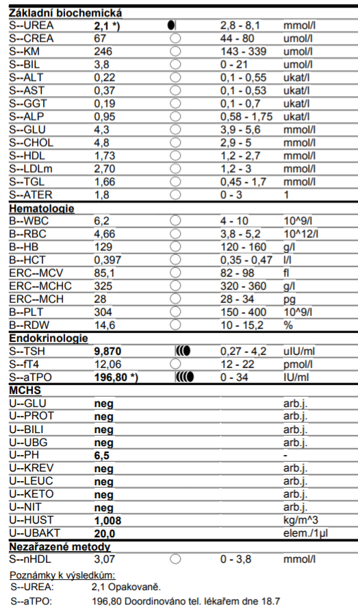 TSH v normě, i když od jara se také zhoršilo, v květnu t.r. bylo 1,5 teď 2,9.