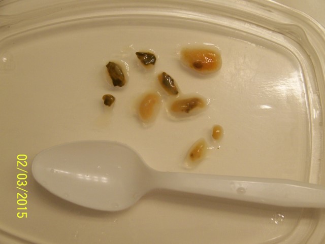 Jinak vysla spousta smetiho a zase neco podobneho jako pred tydnem, vkladam foto, mozna ze Jarda bude vedet co to je, me nic nenapada, nejdriv jsem si myslela, ze jsou to nejaci paraziti, no nevim, treba jsou, kdovi? Ale kdyz to zmacknu, jak ty svetle, tak to hnede, tak se to lepi a tahne jako hrozne husty sliz. Nijak to nezapachalo.