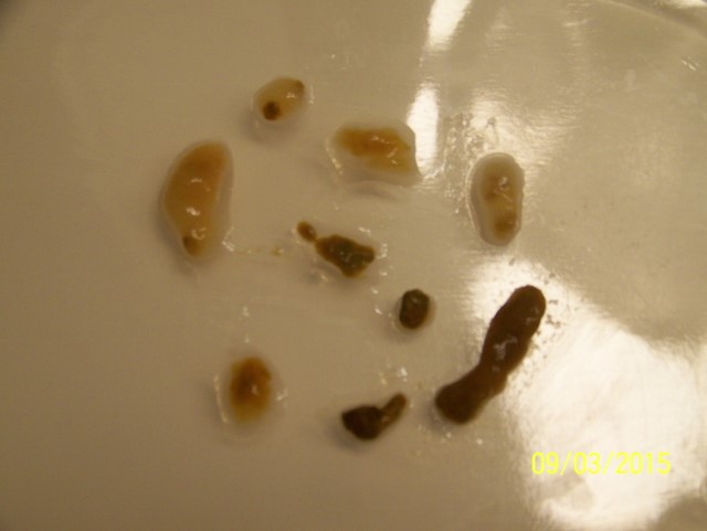 Jinak vysla spousta smetiho a zase neco podobneho jako pred tydnem, vkladam foto, mozna ze Jarda bude vedet co to je, me nic nenapada, nejdriv jsem si myslela, ze jsou to nejaci paraziti, no nevim, treba jsou, kdovi? Ale kdyz to zmacknu, jak ty svetle, tak to hnede, tak se to lepi a tahne jako hrozne husty sliz. Nijak to nezapachalo.....