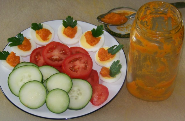 Nakrajej mrkev, cibuli, cesnek a orestuj nejdriv na panvici na oliv. oleji, asi tak 3 minuty cibuli a mrkev, pak tam pridej cesnek a restuj to vsechno dalsi 1 minutu, nakonec k tomu prihod taky nakrajena rajcata, prilej 3 lzice vody a nechej to probublat dalsi 2 minuty. Potom vsechno z panvice premisti do mixeru, pridej rozkrajena habanera, citron. stavu a vse dohladka rozmixuj. Pak to prendej do kastrolka, dochut to jablec. octem (nebo ho nedavej a pridej vic citronove stavy, to je uz na tobe jak si to doladis), soli, peprem, popripade tou melasou a povar to vsechno 3 minuty. Bacha, bude to prskat podobne jako kdyz se vari spenat, takze u toho musis stat a michat. Vysledek by mel vypadat "jakoby velmi husta omacka", nadherne oranzove barvy, velmi lahodne sladko-kyselkavo-ostre mnamy chuti. Je toho 1 plna sklenicka 16oz (to je asi 454g). Po vychladnuti si to uloz do lednicky a zacni to konzumovat az na druhy den, az se ty ingredience pekne rozlozi ...to nema chybu!