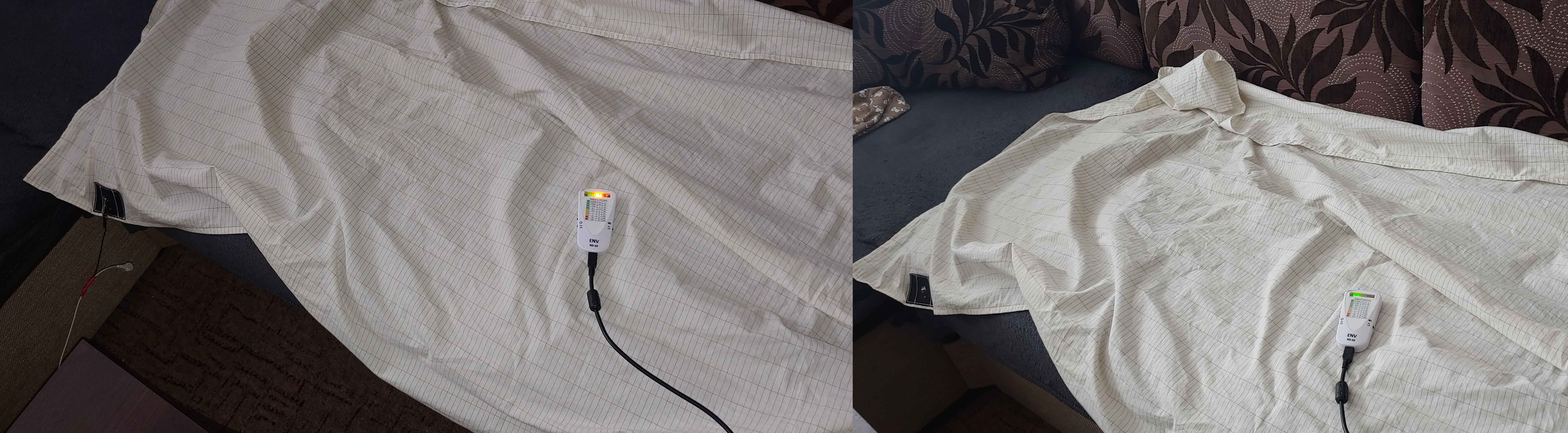 Meral som to gauss metrom. Uzemnenie zvysilo intenzitu elektrickeho pola z cca. 20 V/m na cca. trojnasobok u uzemnovacej plachty zo striebronych vlakien. Uzemnenie na kolik priamo bez 100 K odporu.Skusane aj na radiator a pod.