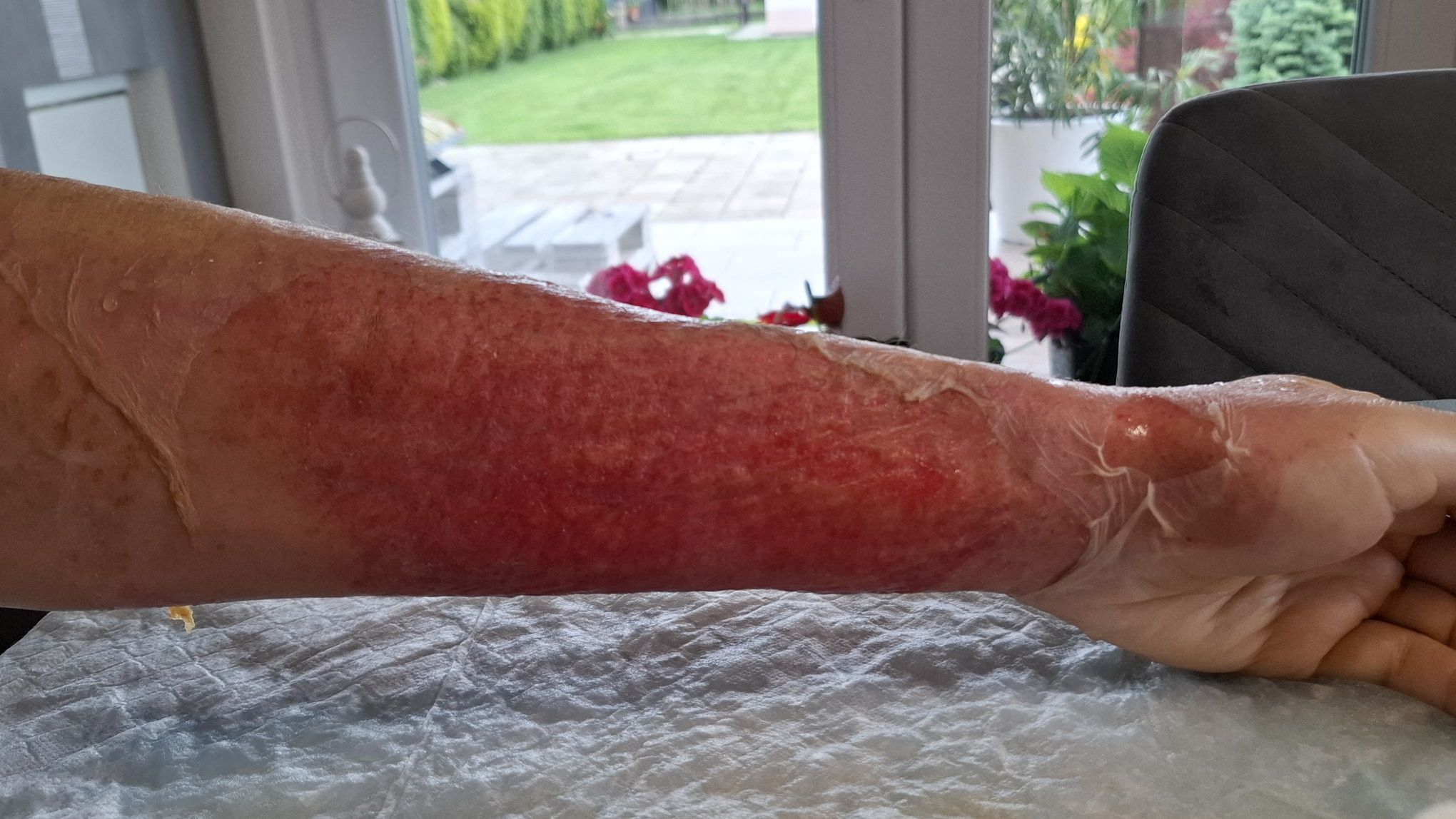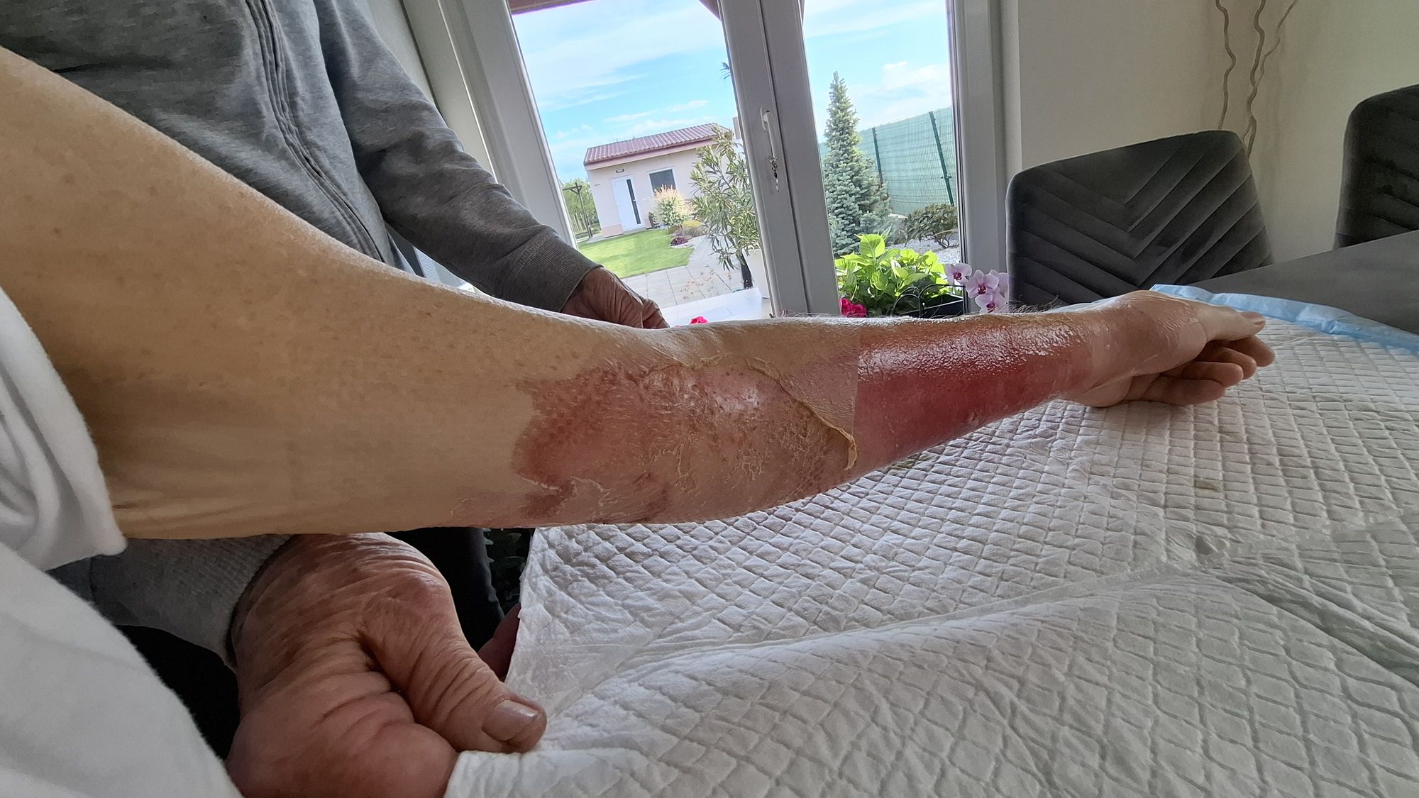 Tak nyní již znáte ředění a máte vyzkoušeno že ani 10x silnější roztok nepředstavuje zcela zásadní problém tedy bych to pod tou slabší koncentrací držel klidně dlouhodobě. Obecně lze tvrdit že naprosto bezpečné by to mělo být až do koncentrace 1:500 z ostré kyseliny na zavřené rány, což je váš případ, ale zkoušel bych pomalu zvyšovat koncentraci. Já sám jsem u sebe přímo do řezné rány aplikoval 3,5%tní roztok, to jsem si teda málem cvrnknul do bombarďáků ale krvácení to zastavilo prakticky okamžitě, rána zčernala a zatáhla se v zásadě ihned a hojila se neuvěřitelně dobře. Tento postup určitě nedoporučuji slabším jedincům, jde o chemickou obdobu vypálení infikované rány žhavým železem což se za našich předků běžně praktikovalo a fungovalo to výborně. Dcera měla ošklivou otevřenou infekci v kloubu na ukazováku ruky což by medicína určitě minimálně antibiotikovala nebo raději rovnou řezala a svolila že ji na to dám tu kyselinu, opět se bavíme o 3,5%tní. Její odvaha byla po kápnutí ihned pryč, zezelenala a málem omdlela, ale když ten první náraz pravdy a lásky rozchodila zlepšování bylo skokové a zánět mizel před očima. Abych vás trochu inspiroval přiložím sem fotoseriálek prvních čtyřech dnů ruky jednoho z mých klientů kde mu infekce svlékla i kůži až na maso. Právě stálý obklad v doporučené koncentraci 1:1500 na to zabral prakticky okamžitě a jak vidíte šlo to v zásadě na holé maso. Otok, bolesti a infekt mizí již první den a tkáň se ihned uzavírá a to vše bez poškození střevního mikrobiomu, což by ATB nutně způsobila. Jinak z vaší fotky je patrné že se vám tam ta tkáň jizví, tedy by to chtělo fibrin rozpouštět pomocí enzymů, třeba Neprinol co máme na e-schopu byl přímo vyvinutý k tomuto účelu a získal v minulosti v USA cenu za výrobek roku.