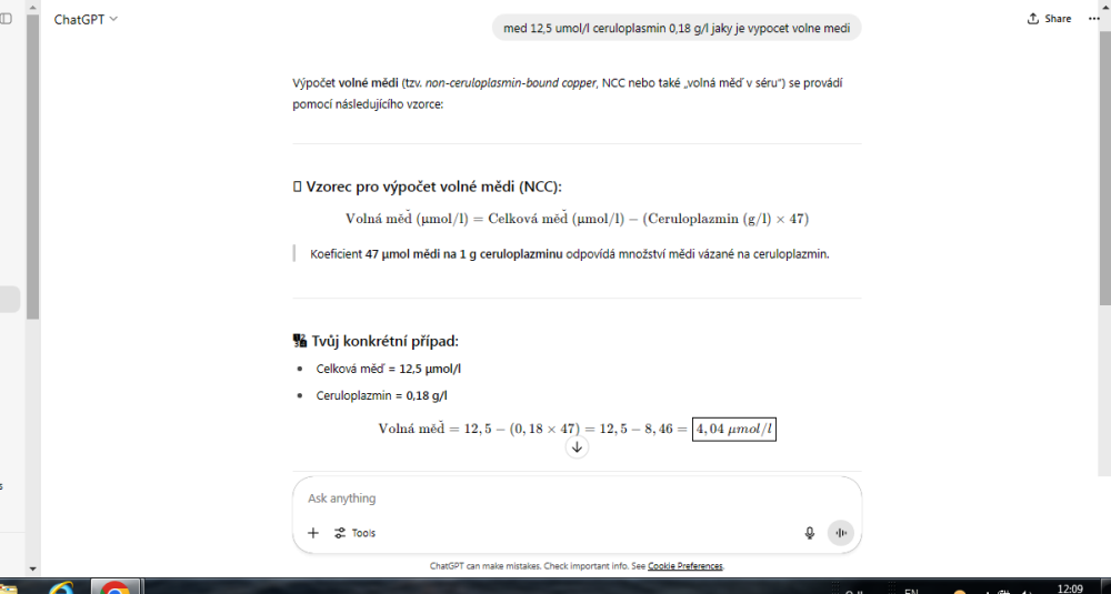 Jinak volná měď = měď - (ceruloplazmin x 47,2) nebo zhruba dvojnásobek hodnoty ceruloplazminu v absolutním čísle bez desetinných čárek jak jsem psal, třeba na měď 15 ceruloplazmin 0,30, ale není to zcela přesné, pouze tak poznáte jedním pohledem že je nebo není velký problém.