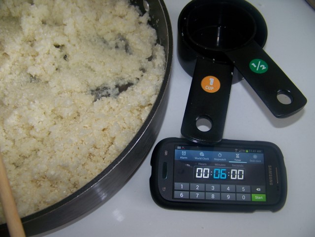 5) No a potom do te kvetakove hmoty pridame 15g parmigiano-reggiano syr (jemne strouhany) a k tomu bud 60g buffalo mozzarelly anebo koziho syra (treba chevron je moc dobry), 1-2 vajicka (podle toho jak velikou hlavu kvetaku jste sehnali a taky podle toho, jaky pouzivate syr, pokud davate kozi syr, tak obycejne 1 vajicko staci, ale to poznate sami, kdyz se vam ta smes bude zdat hodne tuha, tak to druhe proste pridejte a basta fidli.
