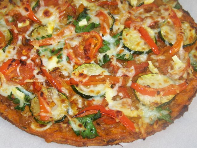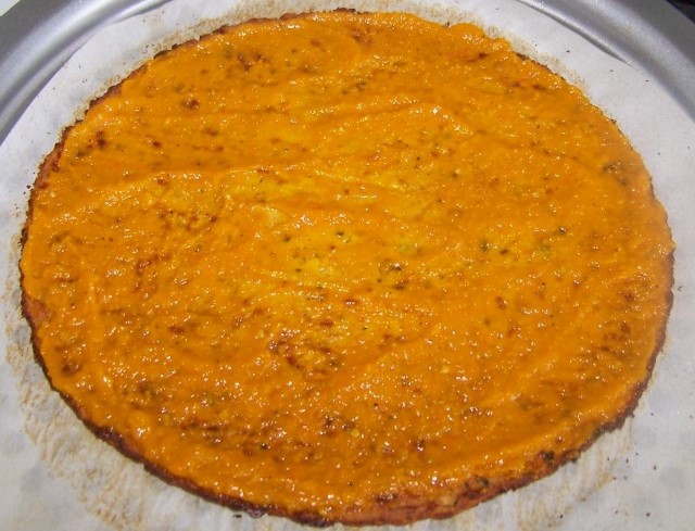 5) Z nasi pripravene smesi budeme mit celkem dva korpusy, takze si to rozdelime na polovinu a na papir (ktery mame uz na tom plechu), uhledne vytvarujeme kolecko, nebo jiny tvar, to zalezi na vas. Ja zadny rantlik nedelam, protoze ja to pecu zhruba 30 minut (behem te doby 2x v troube otacim), pak na to nahlidnu, jestli je to uz zlatave barvy - zespodu!, pokud ano, tak ten korpus tedka otocim a zacinam zdobit. Prichazi muj nejmilejsi okamzik ...napatlam si tam poradne toho uz nekolikrat predtim zminovaneho habanera sauce, mnam!