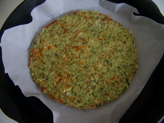 Postupovala jsem podobne jako u pizzy z kvetaku (Zdrava Pizza - (bez mouky a kvasnic), jen s tim rozdilem, ze tentokrat jsem to na panvici nesparila. Jen jsem vse prohnala poradne processorem, vyzdimala v uterce, pridala jsem syr, vejce, okorenila jsem to a upekla na papire z obou stran. Pizzu jsem pekla na zelezne panvici a tortillu na derovane forme na pizzu. To je bozi forma, je urcena na gril a bezvadne se z ni vsechno dostava dolu, pekne to sklouzne, neni tam zadna hrana.