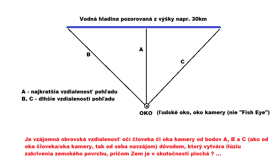 Nejaký text k tomu..... AKO VIETE, že naše oči a oko kamery zachytáva objekty z takej vzdialenosti (ako vs. body A, B, C) rovnako, ako pri pohľade napr. na TV, kde bod A predstavuje jeho stred, a bod B a C jeho kraje ? ... Totiž aj kebyže máme rovnaký "rozsah pohľadu" z takej výšky (30km) vrámci stupňov v porovnaní s tým, keby sme sedeli v určitej malej vzdialenosti od 50 palcového TV na ktorom žiadne zakryvenie neuvidíme, NEMUSÍ TO NUTNE ZNAMENAŤ, že ak uvidíme zakryvenie Zeme z takej výšky, že je to dôvodom jej SKUTOČNÉHO zakryvenia, a nie len dôvodom OPTICKEJ ILÚZIE....