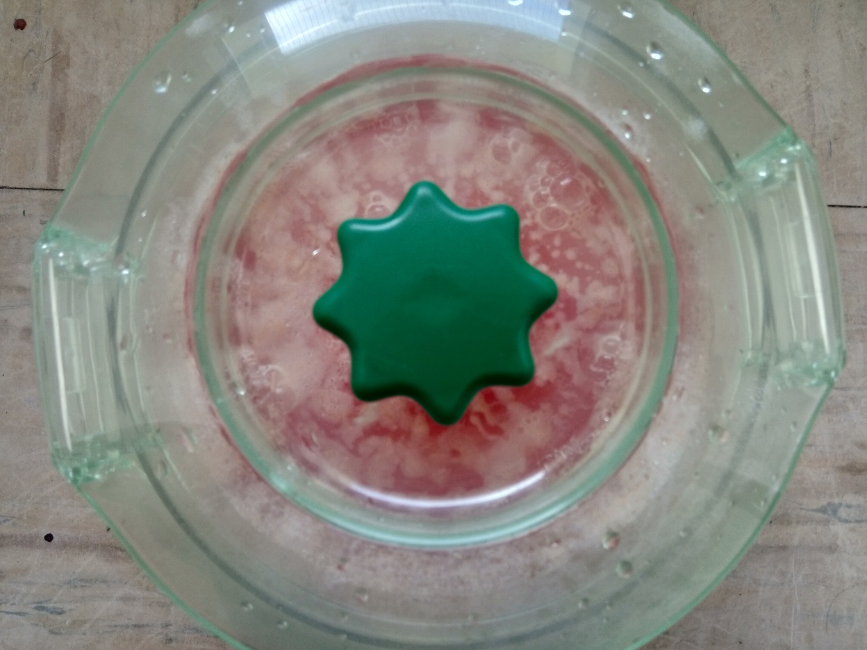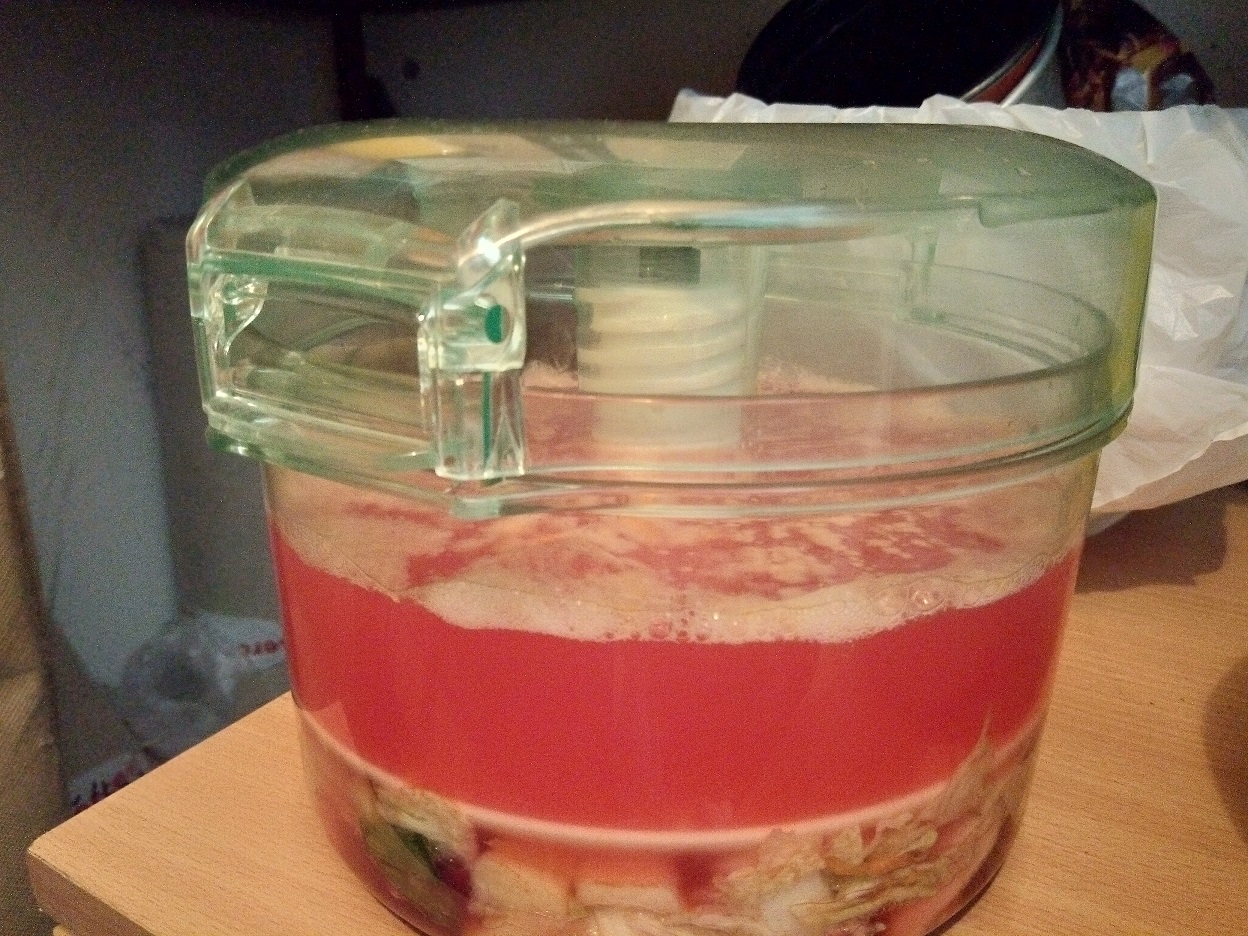 Mixování by podle mě nijak zásadně vadit nemělo i když mě by to mixované asi nechutnalo, jinak při tom pojídání kimchi člověk sliní jako bul dog tedy o sliny bych strach neměl. Pokud jde o vodu já novou vodu nedávám, prostě vždy do nové várky naliji tu vodu ze snědené várky a tím rychleji a bezpečněji najíždí kvašení. Dávám ji jenom tolik aby bylo skoro potopené to namačkané zelí a již za dvě až tři hodiny stejně naskočí kvašení a voda stoupne natolik že ji musím i odebírat aby mě to nevytékalo ven do záchytné misky ve které mám tu lahev postavenou. Oni tam také tolik vody nenechávají v ní pouze změkčí to zelí těch prvních 12 hodin kvašení a poté ji slijí a dají jenom kolik je potřeba.
